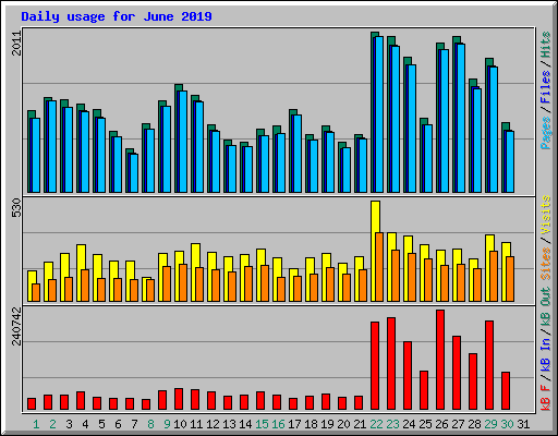 | Day | Hits | Files | Pages | Visits | Sites | kB F | kB In | kB Out | ||||||||